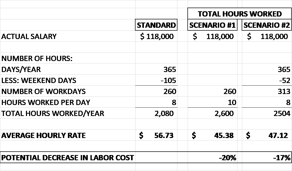 It is important to understand that with total-time accounting, while the amount of salary paid each pay period will remain the same, the effective rate per hour will vary dependent on the number of hours worked during the pay period. This process of calculating an effective hourly rate based on the total hours worked only applies to salary employees since hourly employees are paid for each hour worked at the same rate per hour.
