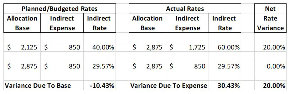 In the example below you see that the planned indirect rate was 40% and the actual rate turned out to be 60%. Twenty points higher. By comparing the planned level of expenses ($850) to the actual allocation base for the period ($2,875) you calculate an indirect rate of 29.57%. The variance between the planned indirect rate of 40% and the calculated rate of 29.57% is a reduction of 10.43% and represents the impact of an increased allocation base on your indirect rate. At this point, the increased allocation base has lowered your indirect rate from 40% to 29.57%. By comparing the actual indirect expenses of $1,725 to the actual indirect allocation base of $2,875 you get the actual indirect rate of 60.0% which is 30.43 percentage points higher than the planned indirect expenses indicating an increase in expenses has offset the impact of the higher allocation base increasing your indirect rate by 20 percentage points.