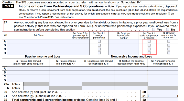 Affected shareholders must first check the box in Part II (Income or Loss From Partnerships and S Corporations), Schedule E of their Form 1040 to indicate if a basis computation is required.