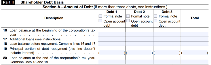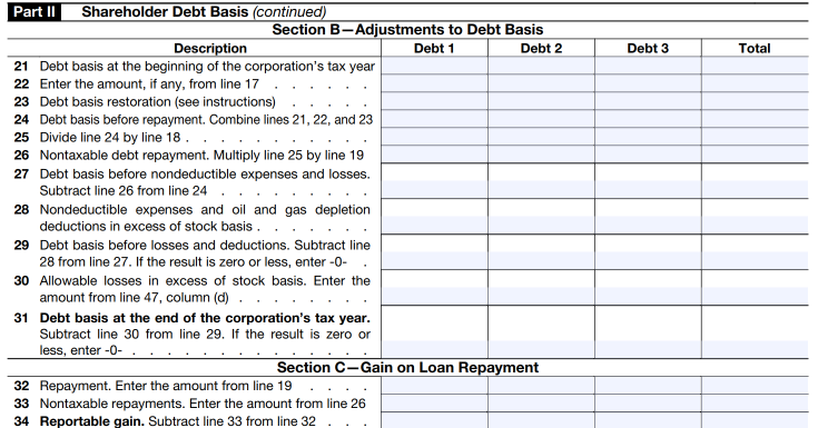 Part II – Shareholder Debt Basis, which will report changes in direct shareholder loans to the S-corporation, such as loan advances and repayments. The debt basis is also now tracked separately by each shareholder loan, and shareholders must indicate if the debt is evidenced by a formal note or is an open account debt. Any gain on loan repayment will now be calculated directly on the form and will flow to other schedules on the shareholder’s tax return.