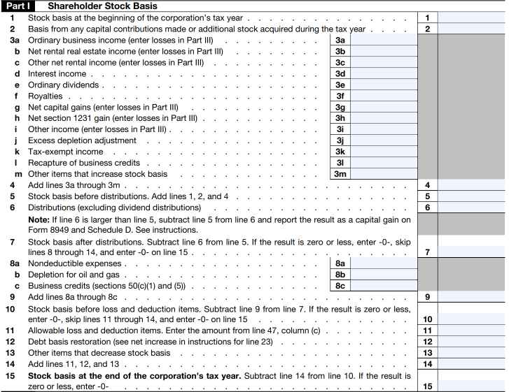 Part 1 – Shareholder Stock Basis, which will report any additional stock contributions each year along with changes to basis from income and deductions reported on the K-1. Distributions will also be reported on this form after the other basis components are included. Any gain on distributions in excess of basis will now be calculated on the form and will flow directly to the Schedule D on the shareholder’s tax return.